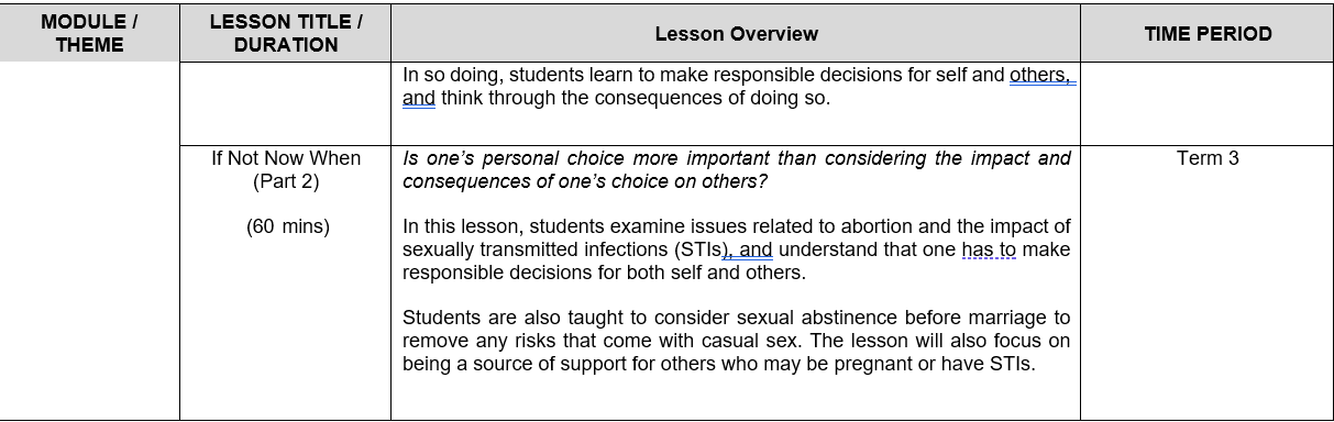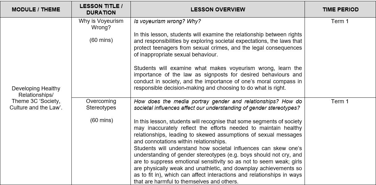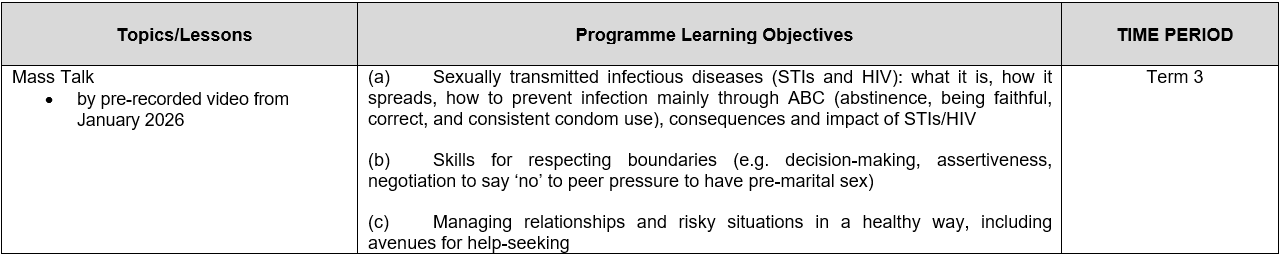At Catholic Junior College, the following Sexuality Education lessons will be taught in 2026: